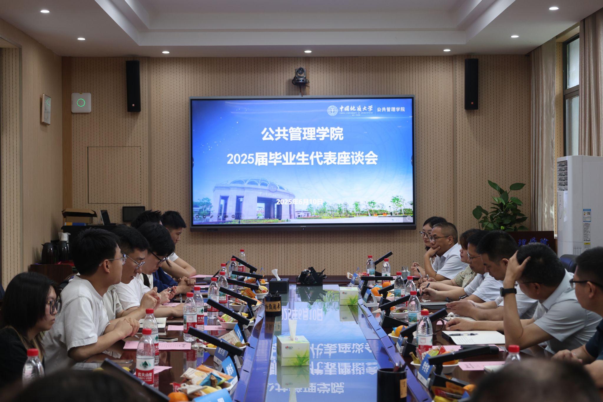 公司2025届毕业生代表座谈会于6月10日在公司B209会议室隆重举行。公司党委书记徐岩,经理龚健,党委副书记龚丽,副经理朱江洪、吕凌燕、王忠、李世祥,土地资源管理系主任方世明,公共行政系书记张光进,研究生教务秘书杨朝琦,毕业生辅导员李姝慧、王青涛及本硕博各专业毕业生代表共聚一堂,共同回顾成长历程,畅谈未来愿景,在温情与期许中为毕业生送上“最后一课”。座谈会由公司团委书记李姝慧老师主持。