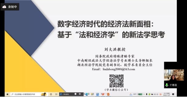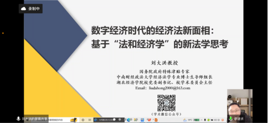 11月27日,应williamhill官网网站法学系邀请,湖北经济公司公司党委副书记刘大洪教授为公司师生作以“数字经济时代的经济法新面相:基于‘法和经济学’的新法学思考”为主题的学术报告。本次报告由williamhill官网网站(武汉)williamhill官网网站副经理才惠莲教授主持,采取线上方式进行。