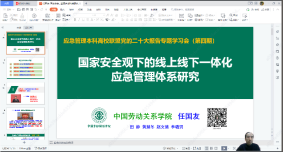 中国劳动关系公司安全工程公司副经理任国友教授作题为《国家安全观统领下的线上线下一体化应急管理体系构建研究》的主旨报告。任国友教授从我国现行应急管理体系的主要弊端与关键问题入手,依据应急管理四阶段理论,提出应急管理体系线上线下一体化设计原理,构建“应急文化、应急资源、应急运作、应急恢复和应急组织”为核心的应急管理“4+1”模型。在此基础上,任国友教授以雄安新区为例,从线上线下2个维度设计并构建了雄安新区线上线下一体化应急管理体系,并展望了线上线下一体化应急管理体系在国家应急管理体系现代化的改革实践和社区应急管理体系建设中的推广前景。