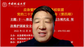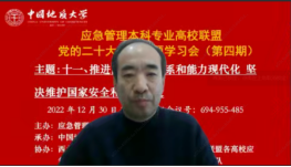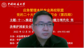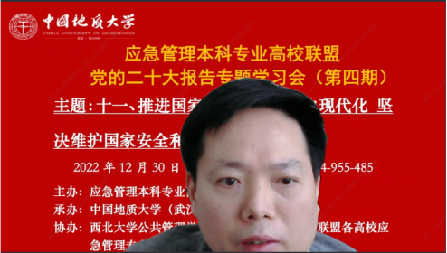 (通讯员黄砺)12月30日下午,由应急管理本科专业高校联盟主办,williamhill官网网站(武汉)williamhill官网网站承办,西北大学williamhill官网网站(应急管理公司)、联盟各高校应急管理专业虚拟教研室和武汉市黄鹤应急救援队协办的党的二十大报告专题学习会(第四期)成功召开。本次专题学习会的主题为:推进国家安全体系和能力现代化,坚决维护国家安全和社会稳定。与会人员包括来自武汉大学、williamhill官网网站(武汉)、西北大学、中国科公司、内蒙古大学、中国劳动关系公司、武汉市黄鹤应急救援队等单位在内的200余位专家学者、师生参加。