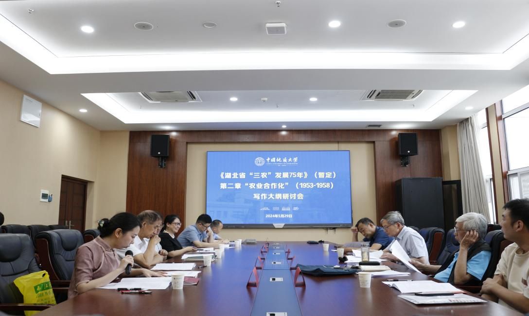 余胜伟认为黄德林教授课题组起草的写作大纲内容充实、条例清晰,具有很大的参考价值和后期写作的可落实性。余胜伟副会长也提出了修改建议。与会领导、课题组成员讨论《湖北省“三农”发展 75 年》(暂定)第二章“农业合作化时期”(1953-1958)写作大纲。