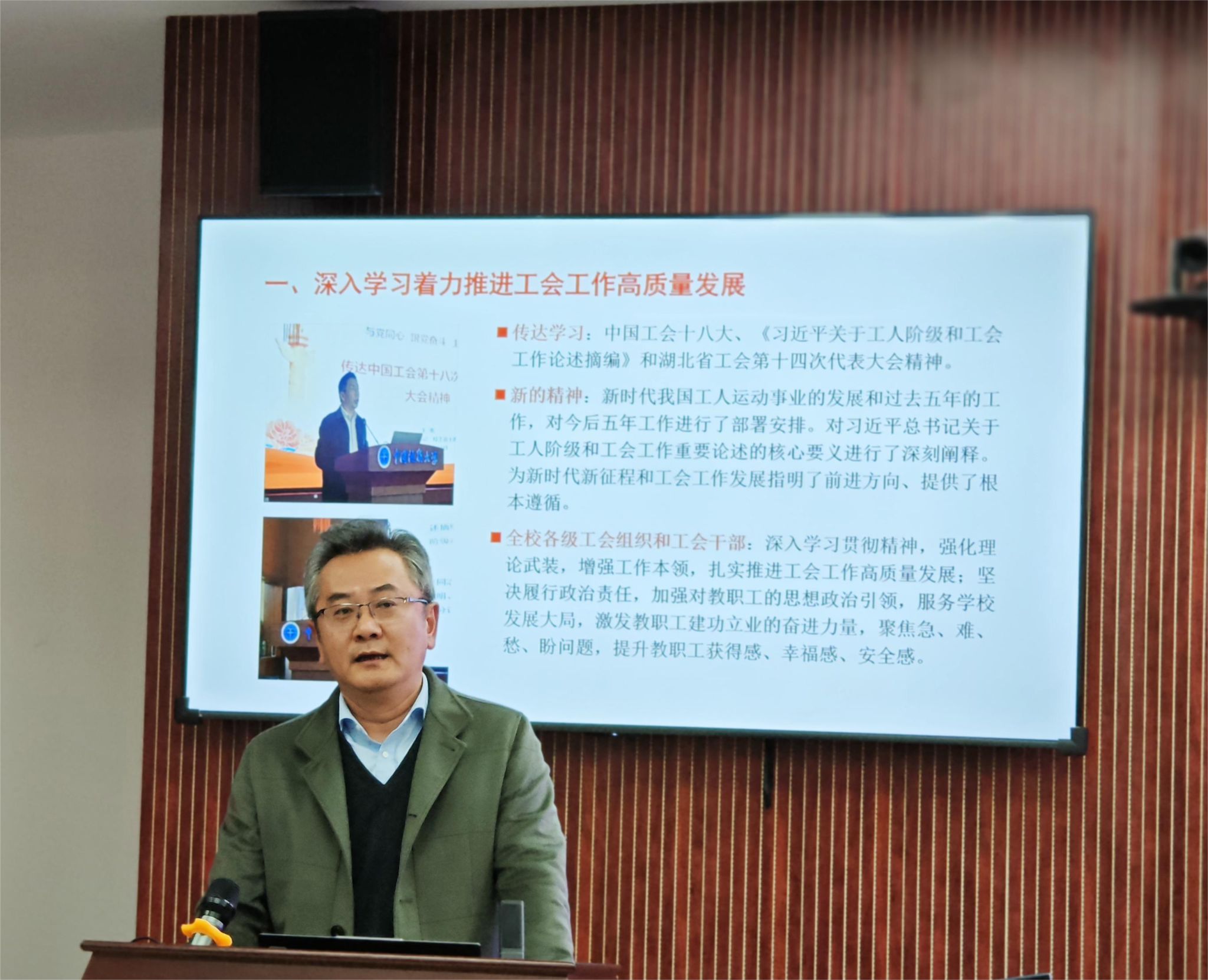 会议第四阶段,进行第三届教职工大会第三次会议暨第三届工会会员大会第三次会议。工会主席曾伟向全体工会会员报告工会工作,经理胡守庚作公司财务公开报告。大会以举手表决方式选举彭涛教授为公司新的工会主席。