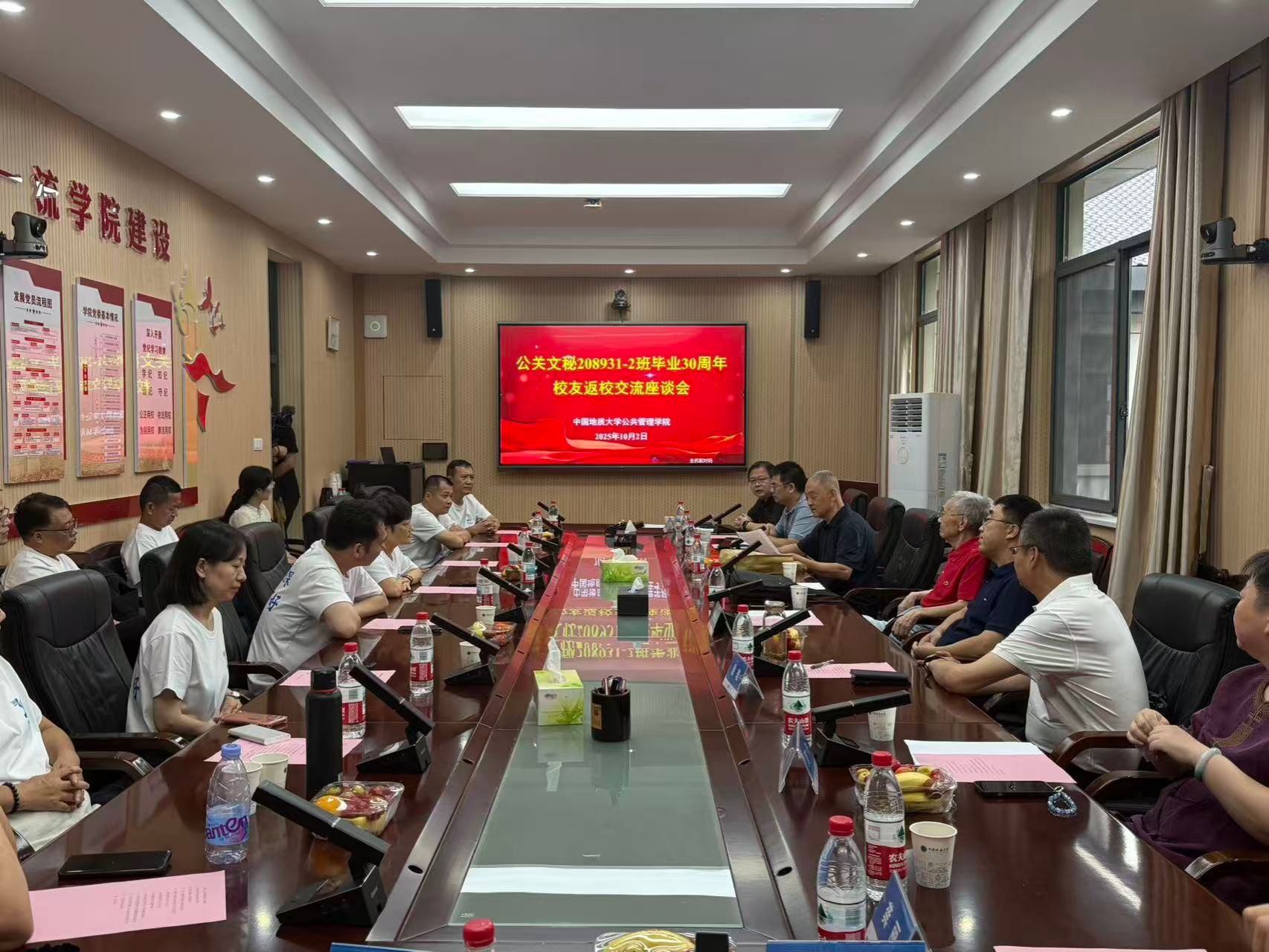 10月2日下午,1995届现代文秘与公共关系专业208931、208932班员工和2005届土地资源管理专业023011、023012班员工在公司举行师生座谈会。公司党委书记徐岩,经理龚健,党委副书记龚丽,副经理朱江洪,公司老领导、原班级班主任、授课教师代表、各系领导参加座谈会。
