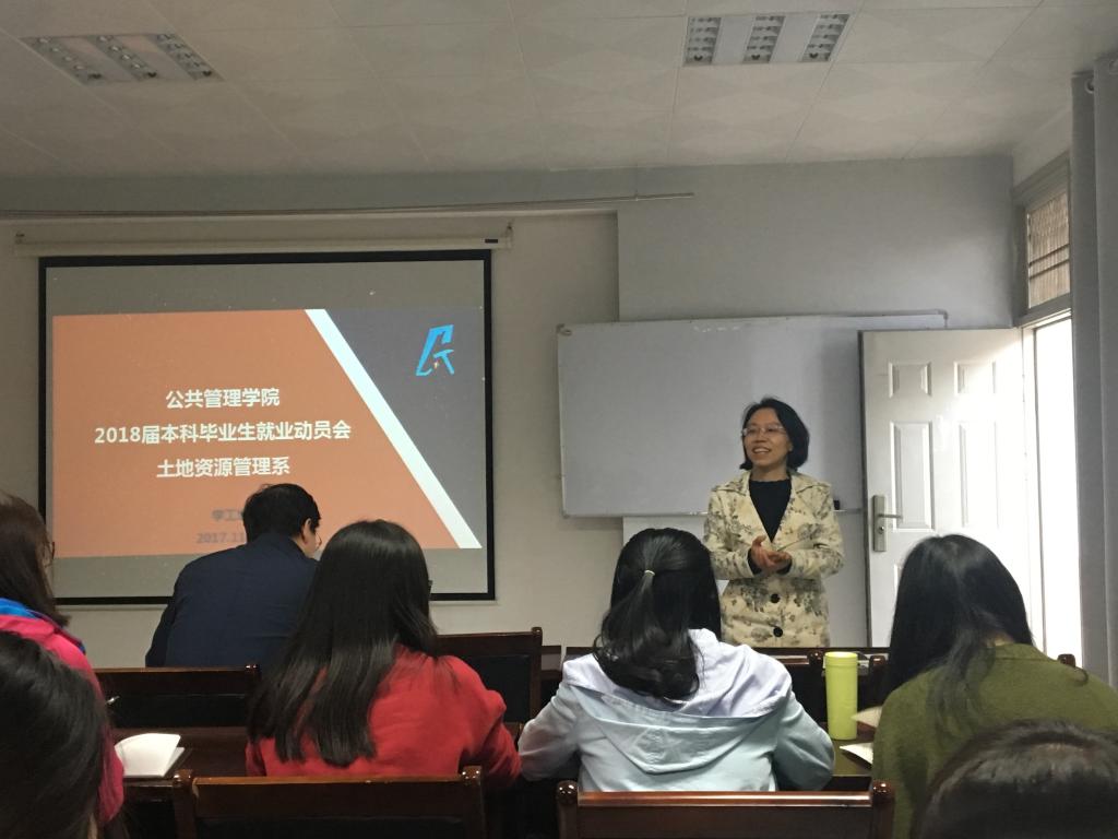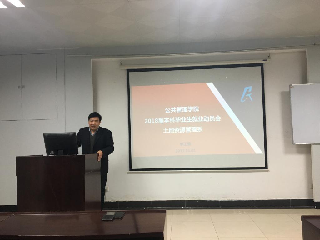 2017年11月1日下午4点,williamhill官网网站土地资源管理系2018届本科毕业生就业动员会在公管新楼101室顺利召开。公司副经理王占岐,公司党委副书记胡文勤,土地资源管理系教授周学武、班主任渠丽萍,院团委副书记、2018届本科生辅导员李姝慧以及土地资源管理专业2018届本科毕业生参加此次会议。