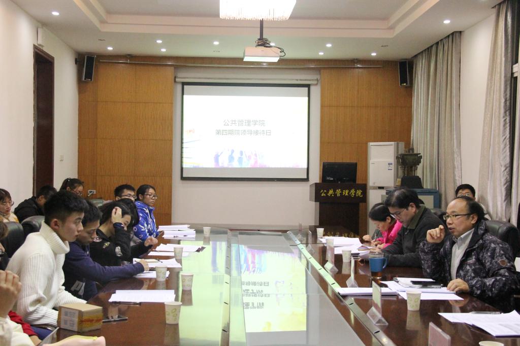 12月13日晚六点半,2017年williamhill官网网站第四期院领导接待日在公管楼B209成功举行。出席本次会议的领导有公共管理公司党委书记张吉军老师、党委副书记胡文勤老师、法学系副主任吕凌燕老师、公共行政系副主任刘中兰老师、区域规划与信息技术系主任刘超老师、土地资源管理系主任朱江洪老师、团委副书记李姝慧老师。本次会议主要围绕解决公司员工在老员工活中遇到的各种问题,发现并解决公司建设中存在的问题与不足来展开。