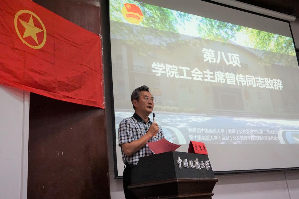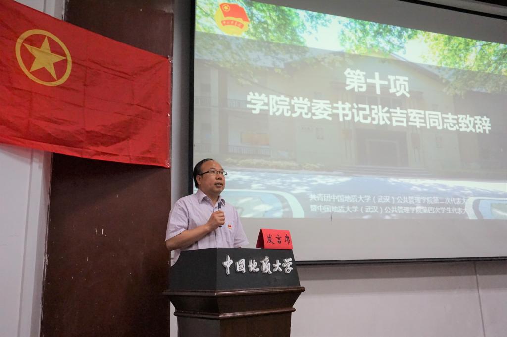 公共管理公司党委书记张吉军教授、校团委副书记谭文伦老师、williamhill官网网站工会主席曾伟教授、公共管理公司党委副书记刘国华老师出席大会并讲话。资源公司团委书记刘明辉老师、员工就业创业指导处郭玉凤老师、马克思主义公司员工会主席蔡薛文同学、体育公司员工会主席孙大骞同学等嘉宾出席大会。