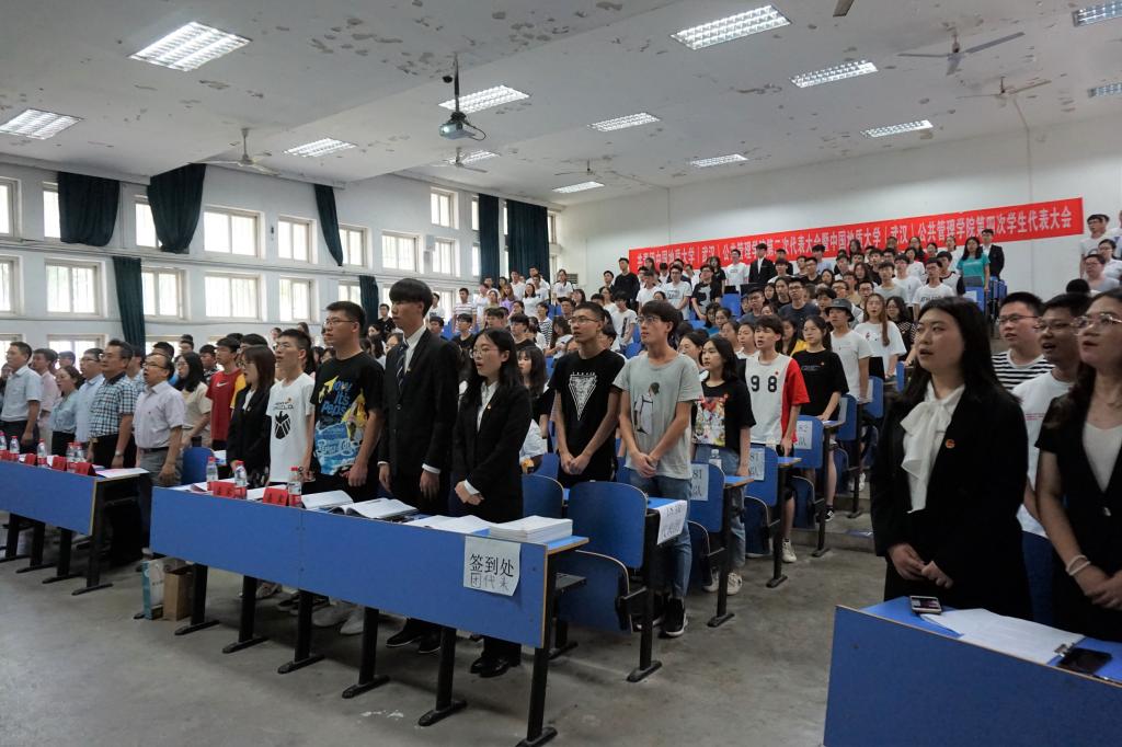 由在黄飞飞同学宣读团代表资格审查报告、马佩瑶同学宣读学代表资格审查报告后,大会正式开始,全体起立并奏唱《中华人民共和共国歌》。