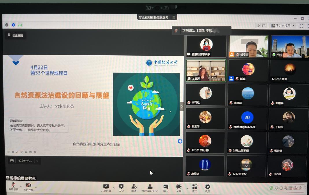 作为自然资源系统内首家人文社科类重点实验室,自然资源部法治研究重点实验室充分发挥法治宣传中心、学术交流中心的平台功效,自挂牌成立以来多次成功举办“422地球日”纪念活动。今年实验室结合近期《自然资源部关于加强自然资源法治建设的通知》文件发布实施的背景,邀请文件的核心起草人员、自然资源部不登记中心李炜研究员,对我国自然资源法治建设的历程进行阐述、交流。李炜研究员指出,经过多年的探索发展,我国当前自然资源法律体系日益健全、高效透明,对自然资源高效利用、充分保护提供了制度性保障,但在系统性、整体性和协调性方面仍需与时俱进、结合生态文明体制改革进一步完善,并对未来我国自然资源法律制度改革、立法推进等工作进行了展望。唐健教授、王占岐教授、才惠莲教授、徐明教授等师生就土地三项改革进展、国土空间规划立法等问题与李炜研究员进行深入的交流和讨论。