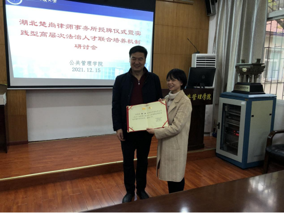 (通讯员李继杰)12月15日,湖北楚尚律师事务所法律人才培养基地授牌仪式暨实践型高层次法治人才联合培养机制研讨会在公司举行。公司党委书记张宽裕、副经理才惠莲、副经理王忠、法学系班子成员、法学系部分教师,湖北楚尚律师事务所党支部书记付凤鸣、主任张靓、合伙人彭洪等出席仪式。会议由副经理王忠主持。