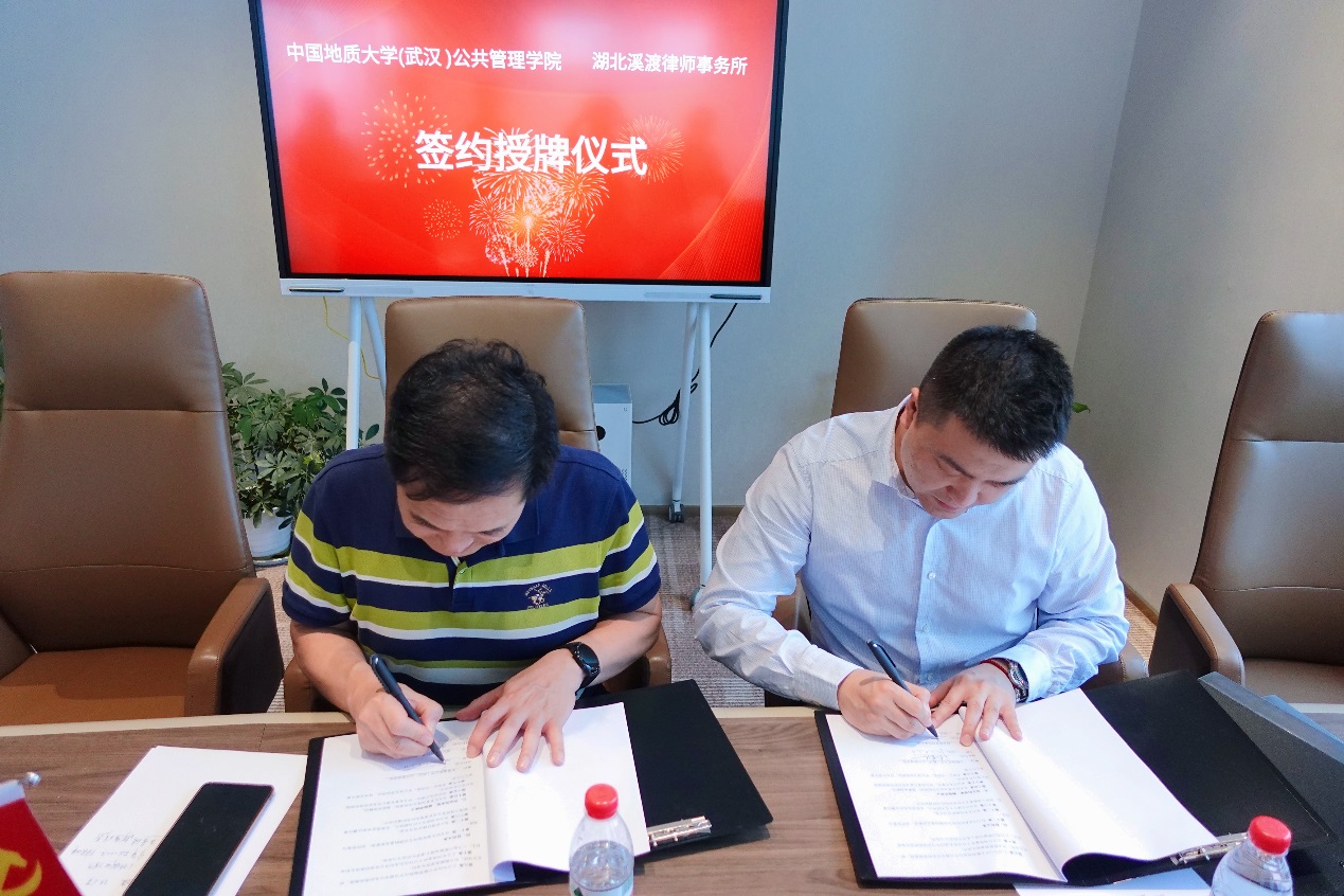 炎炎日正午,灼灼火俱燃。中午12时,签约授牌仪式正式启动:张宽裕书记和谢雄峰书记来到签约台就坐,分别代表地大williamhill官网网站与溪渡律师事务所签署了《合作协议》。