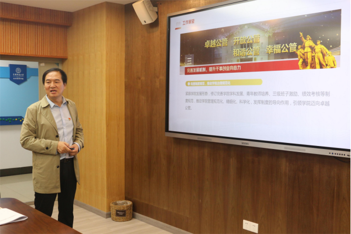 经理胡守庚重点汇报公司团队队伍建设、学科发展、科研平台建设等情况,并就公共管理学科跨越式发展计划向唐书记进行汇报。