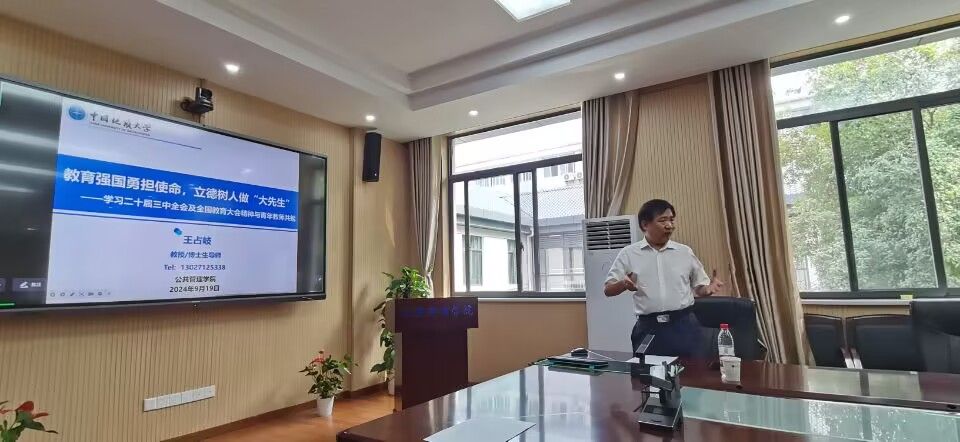最后,王占岐结合工作实际讲述了导师们如何践行立德树人使命,立志做新时代的“大先生”。研究生教育目前已由规模扩张转向注重内涵式高质量发展,青年导师要开好头、起好步,为员工们把好每一道培养质量关。王占岐引用“师者,所以传道授业解惑也”,强调一名优秀的导师要努力做到“经师”和“人师”相统一。同时将自己多年的育人经验和感受分享给在场的每一位导师,希望各位导师都能成为拥有大道、大德、大学问、大成果、大贡献、大爱心和大奉献的“大先生”,不忘立德树人初心,牢记为党育人、为国育才使命,为人师表、爱岗敬业、踔厉奋发、勇毅前行,在建设地球科学领域世界一流大学的征程中取得更大成绩,为实现中华民族伟大复兴的中国梦作出贡献!