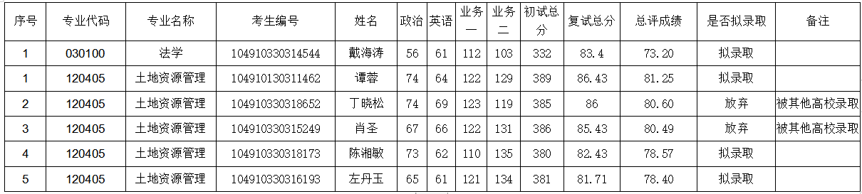 考虑williamhill官网网站学科发展需求,经公司申请,研究生院同意,给予公司法学专业增加一个指标,土地资源管理专业增加3个指标。现将补录结果公示如下(顺位录取。如有放弃,顺次录取):