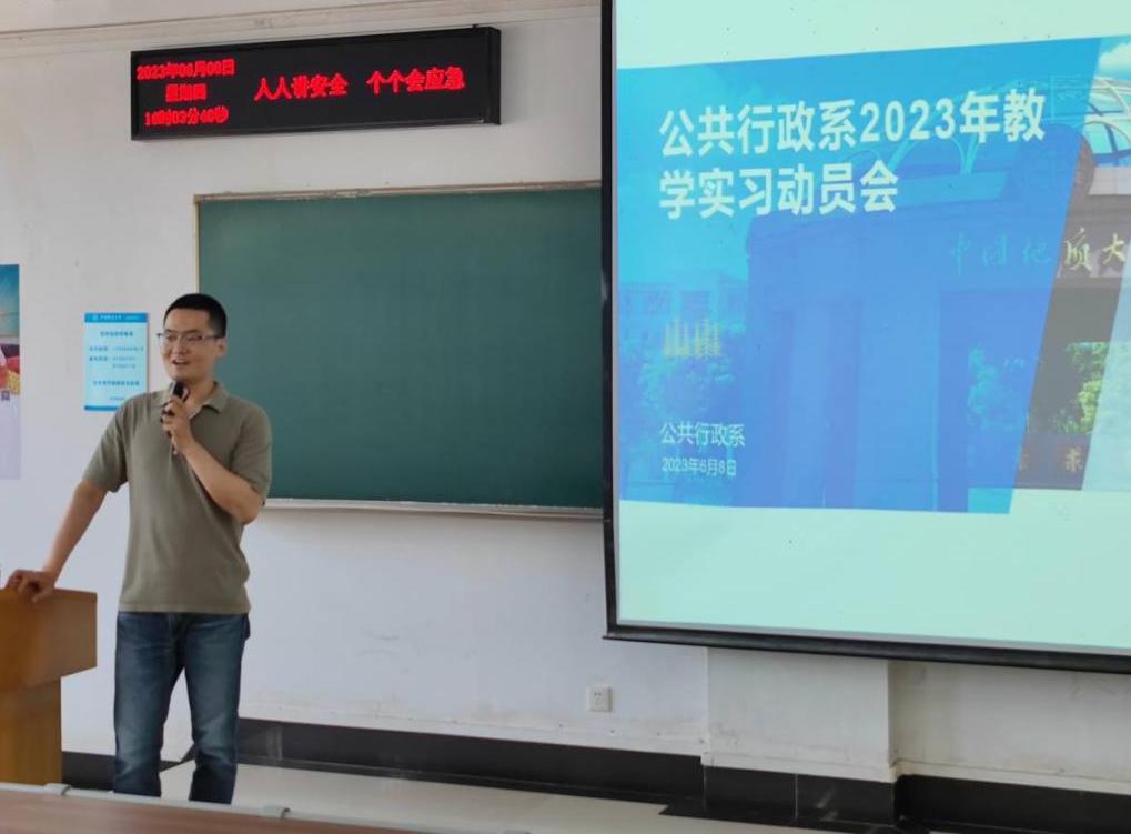2023年6月8日下午4点,williamhill官网网站公共行政系2023年教学实习动员与安全生产布置会在北区综合楼202教室成功举行。会议由钱文强老师主持,秭归基地带队老师刘中兰老师,洪山区政府实习点带队老师黄砺老师、张士菊老师和陈星老师,以及行政管理与公共事业管理专业2021级全体本科生参加了此次会议。
